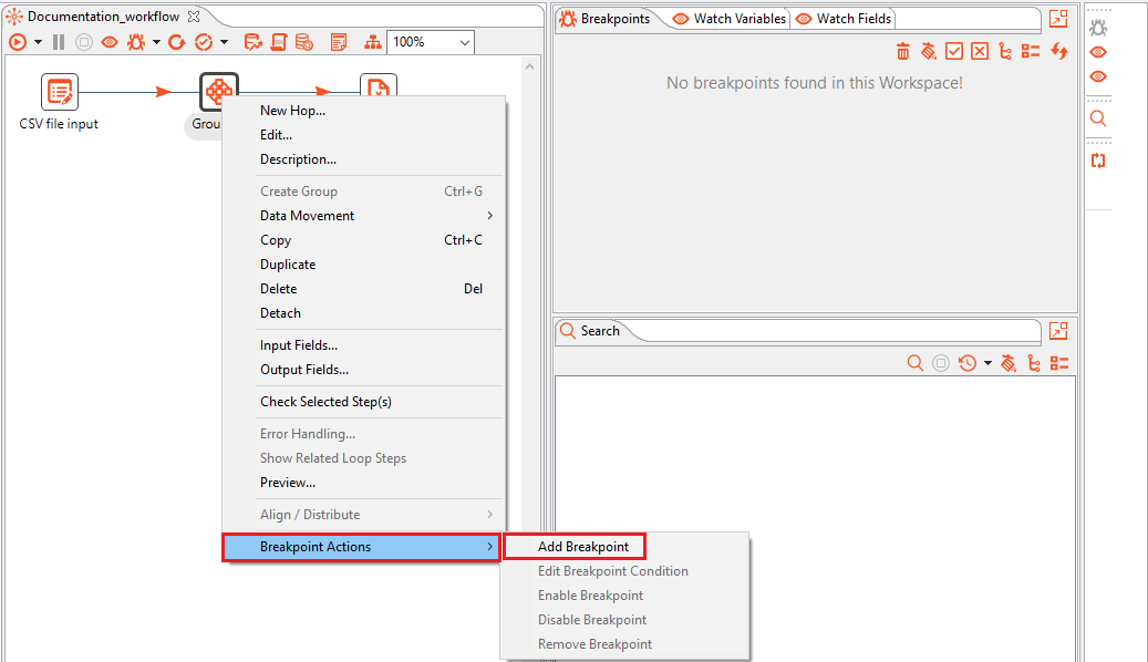 Right-click on the selected step and in the contextual menu, select Breakpoint Actions. The sub-contextual menu appears.