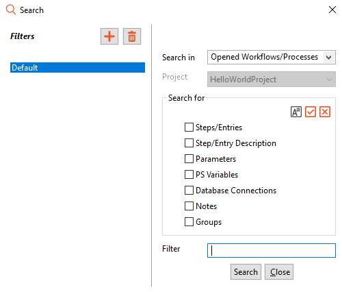 - If you add or select existing filters, then the field Filter Name appears in the dialog box.Search in Select the scope of search. Available search scope options are:
