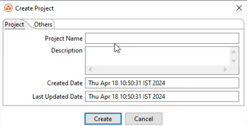 NOTE: It is recommended not to use special characters in your project name.Description Enter a description of the project. Created Date Displays the project creation date and time. Last Updated Date Displays the date and time when the project was updated. Others tab: Associated Process Name Specify the name of the process that you want to associate with the project.