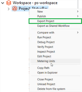 In the Project Explorer, select and right-click on the project from which you want to share the workflow. The contextual menu appears.