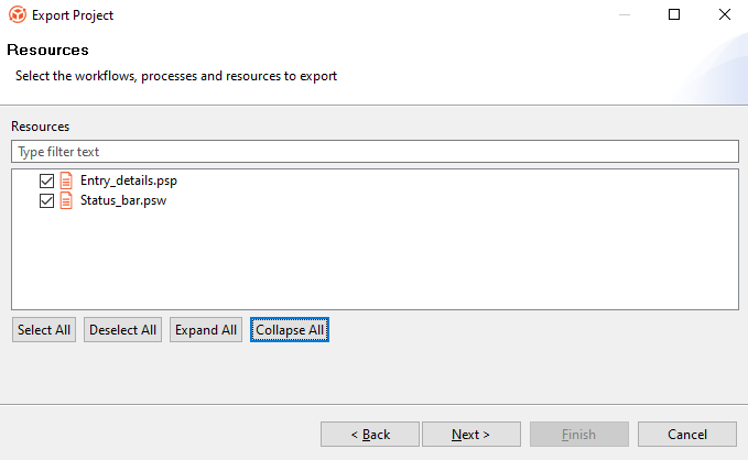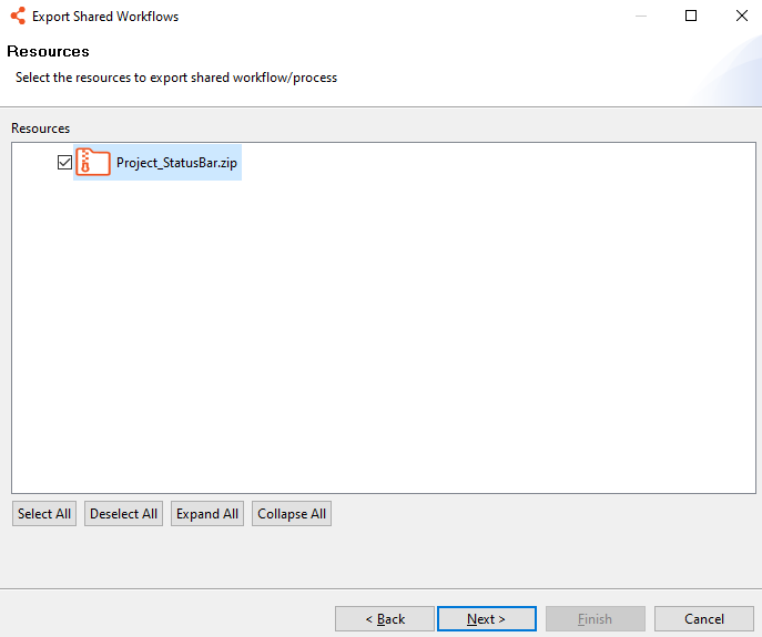 In the Resources dialog, select the required checkboxes. The selected workflows, processes, and resources are added to the zipped project file.