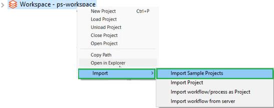 Before creating a new project, you can work with sample projects. Sample projects are bundled with your Process Studio and are available in the ps-home/samples directory. You can import the projects using the Import 🡪 Import Sample Projects option in the contextual menu.