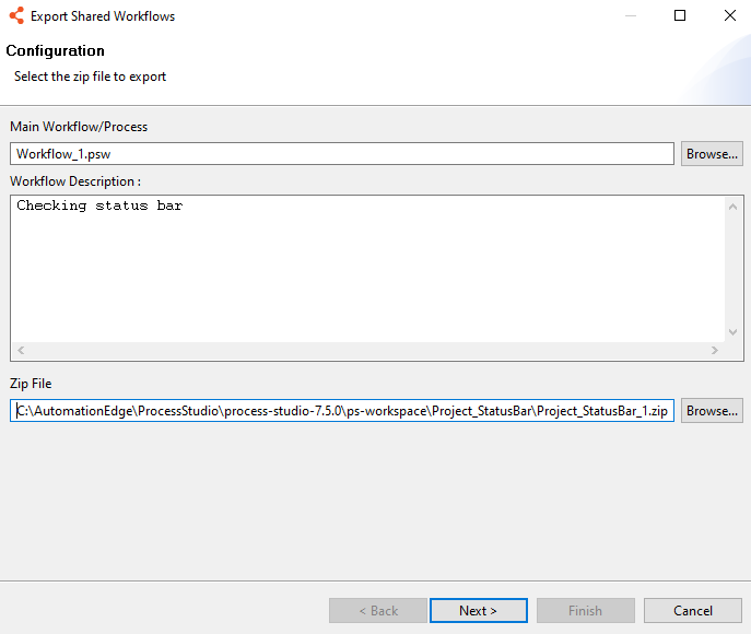 NOTE: To modify the details, click Browse and select another workflow or process from the project.Workflow Description Enter a description about the workflow. Zip File Displays the zipped project folder path of the workflow you want to export.
