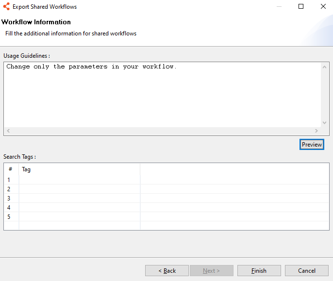 In the Usage Guidelines field, enter the instructions for using the workflow, and in the Search Tags field enter the tags for searching the shared workflow in the Process Studio or the AutomationEdge UI.