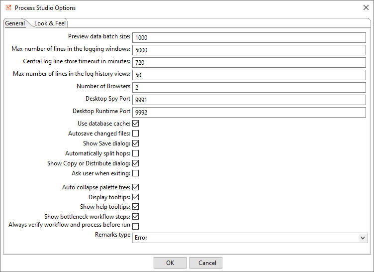 The Process Studio Options dialog, has two tabs, General and Look & Feel.