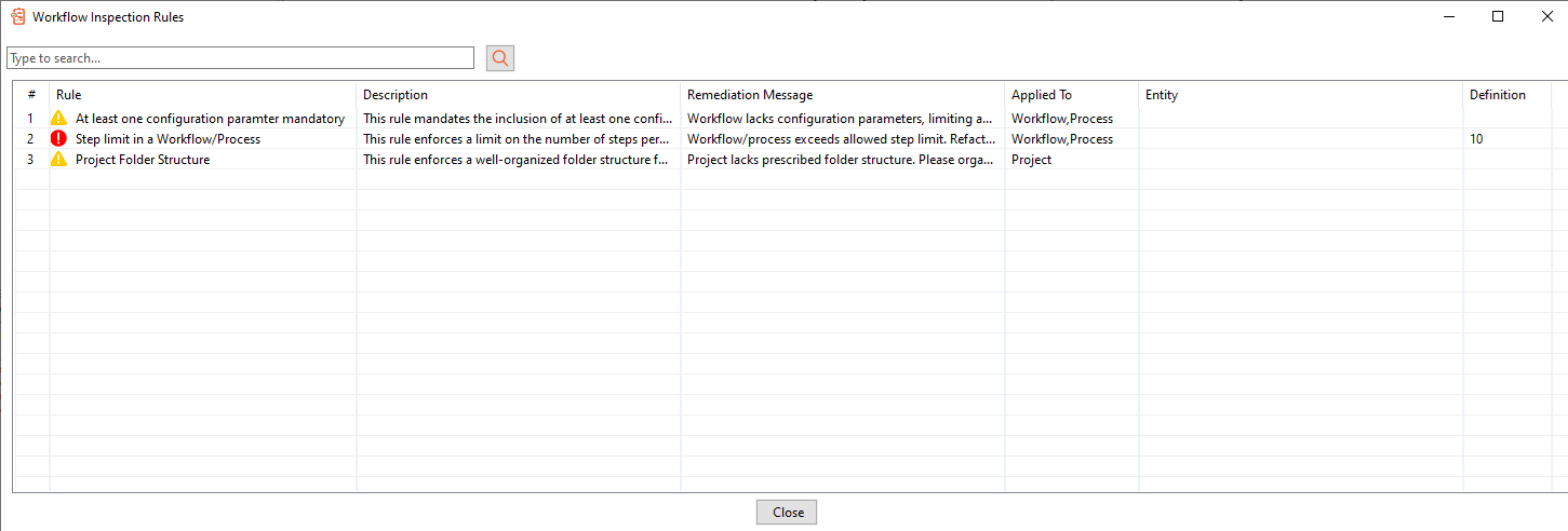 Again, click Tools 🡪 Show workflow inspection rules. The Workflow Inspection Rules dialog appears.
