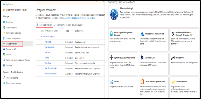 - Click ‘Microsoft Graph’ as highlighted below on the top right corner.