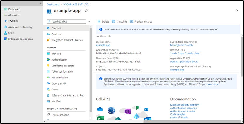 - Upon registration, fetch Tenant ID and Client ID for the App as seen below.