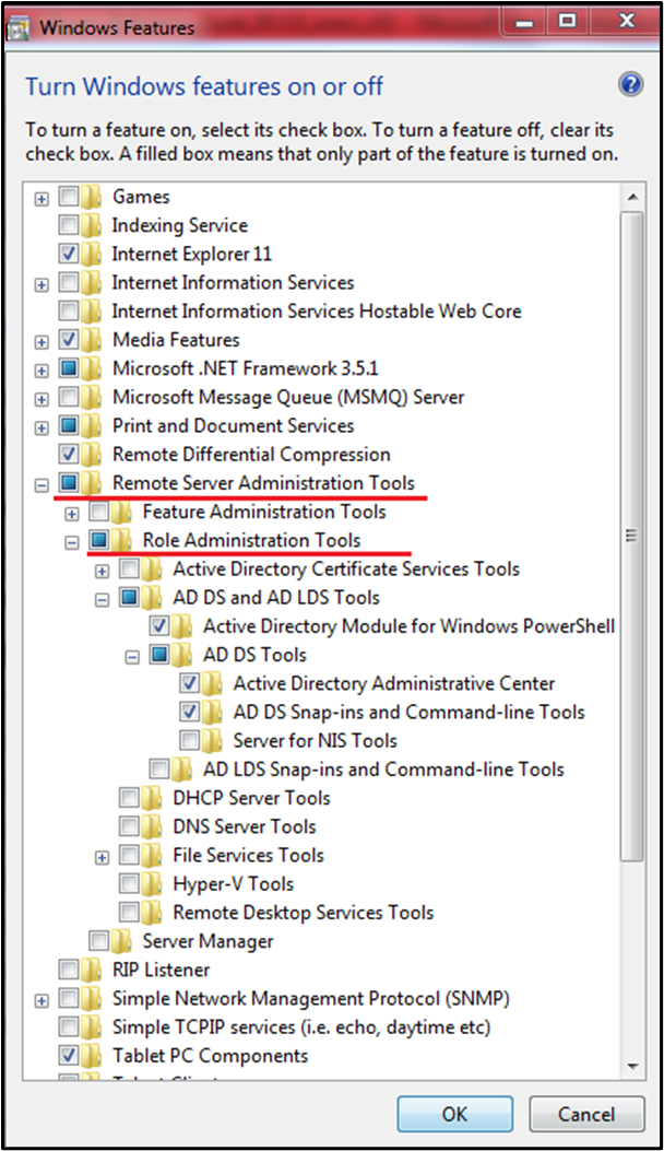 For RSAT on Windows Vista and Windows 7, you must enable the tools for the roles and features that you want to manage after you run the downloaded installation package. Note: You don't have to do this for RSAT on Windows 8 or later versions. To install Active Directory on Windows Vista and Windows 7, click on Remote Server Administration Tools, click on Role Administration Tools, check the AD DS and AD LDS Tools option and click on OK.