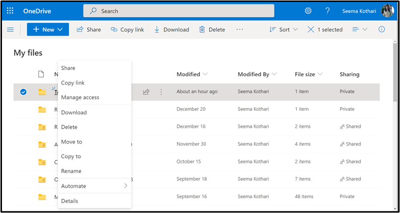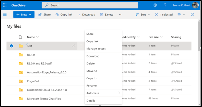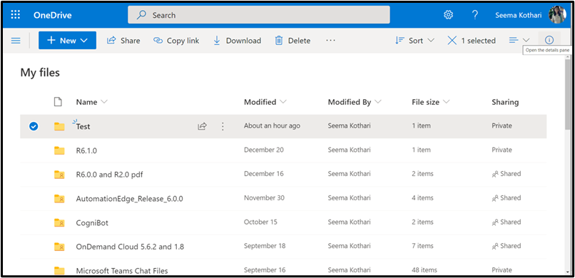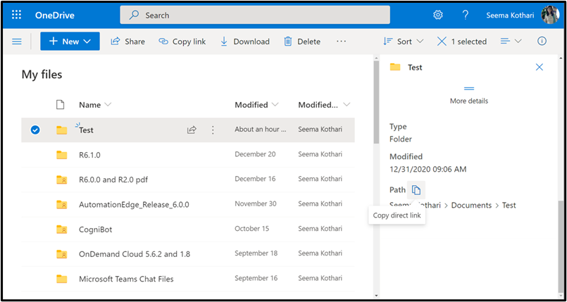 In this case the folder path appears as follows, https://automationedge1-my.sharepoint.com/personal/seema_kothari_automationedge_com/Documents/Test