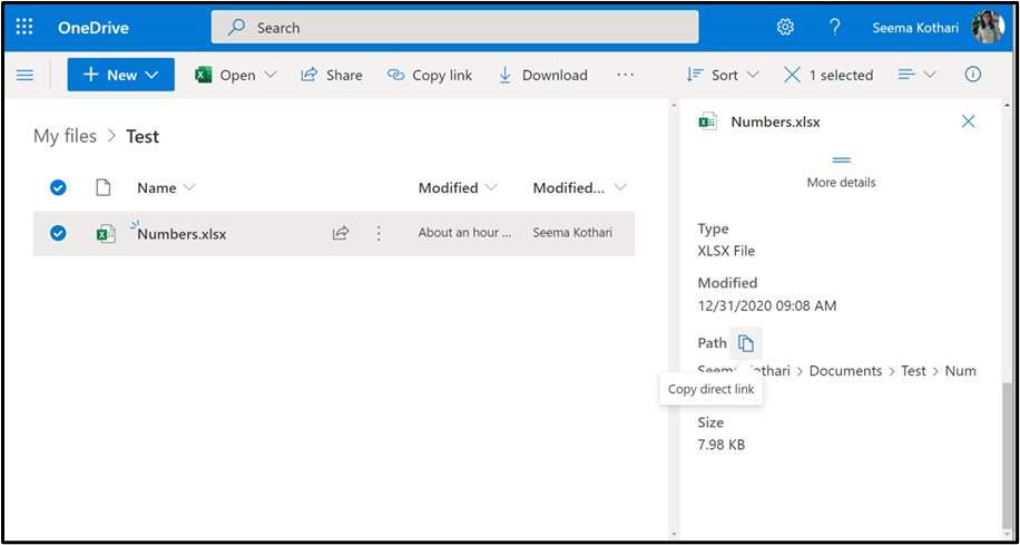 - In the details pane navigate to the bottom and click the ‘Copy direct link’ icon for the Path.